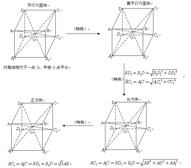 2、回想平行六面体的概念。联想平行四边形,长方形如正方形定义及其相互联系。你认为将产生什么样的特殊平行六面体,它的对角线该有什么性质?