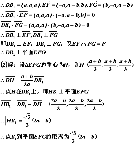 (1)证明:建立如图所示的空间直角坐标系D-xyz,则D(0,0,0),B1(a,a,a),E(a,b,0),F(0,a,b),G(b,0,a)