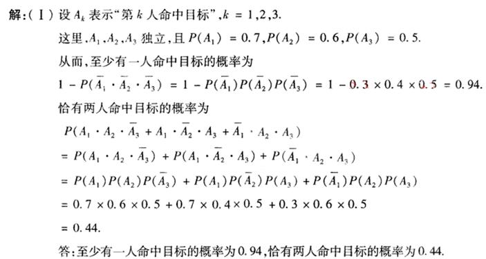 设甲、已、丙三人每次射击命中目标的概率分别为0.7、0.6和0.5。