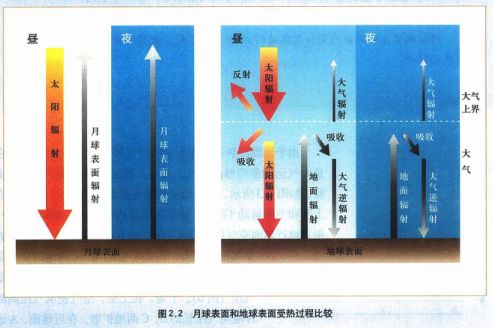 〖案例〗大气的受热过程 月球表面和地球表面受热过程比较 大气在增温的同时,也向外辐射热量。大气辐射的方向既有向上的,也有向下的。大气辐射中向下的部分,因为与地面辐射方向相反,称为大气逆辐射。根据辐射热交换的原理,分析下面两个问题。 (1)大气逆辐射的存在,对地面有什么作用?如果用“大气保温作用”概括,你认为合适吗? (2)根据图2.2分析,为什么月球表面昼夜温度变化比地球表面剧烈得多?