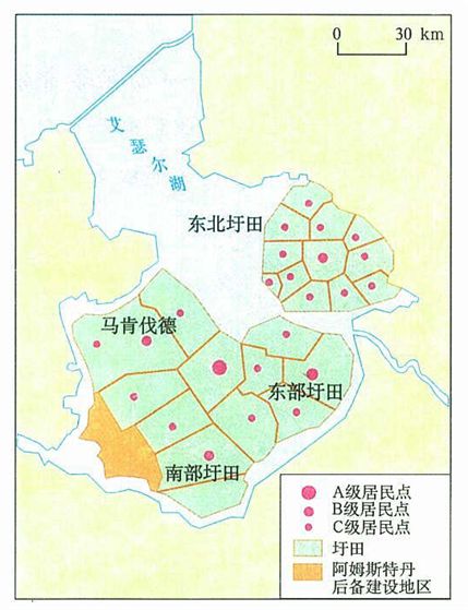 〖案例〗德国南部城市等级体系的启示 荷兰圩田居民点的设置 荷兰人在围海造田得来的圩田上规划居民点时,设计者把居民点分为三级,并且充分考虑了各级居民点的人口,根据人口的需求来布置相应的功能。例如,c级居民点大约有3 000名居民,设有生活用品、烟草和报刊等门市部,以及咖啡、饮食店、加油站和邮局;B级居民点有35 000名居民,设有纺织品、家具、书刊、钟表等专业门市部,还有专科医生诊所、医院、中学、职业学校、剧场、游泳池;A级居民点服务于圩田上的所有居民,设施比较好,超过了c级和B级。在选择位置时,设计者也尽量把高一级的居民点设在低一级居民点的中央(图2.16),这样可以最大限度地方便圩田上的全体居民。由于设置合理,整个圩田地区的农业和居民点都迅速发展了起来。