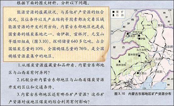 〖案例〗山西煤炭资源的综合利用 1、万家寨引水工程 ①建设引水工程的原因:能源重化工业发展需要消耗大量的水资源;山西省年降水量少,地表水缺乏。 ②缺水严重地区:晋北地区(大同一带)和晋中地区(太原一带) ③山西省最大的水利工程——万家寨引水工程 ④作用:缓解了太原、大同、朔州桑中兴城市缺水的局面。 2、内蒙古东部地区矿产资源分布
