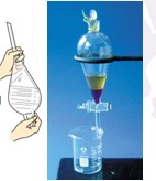 〖操作要点〗 (1)将要萃取的溶液和萃取溶剂依次从上口倒入分液漏斗,其量不能超过漏斗容积的3/4,塞好塞子进行振荡。 (2)振荡时右手捏住漏斗上口的颈部,并用食指根部压紧塞子,以左手握住旋塞,同时用手指控制活塞,将漏斗倒转过来用力振荡,同时要注意不时地打开活旋塞放气。 (3)将分液漏斗静置,待液体分层后进行分液,分液时下层液体从漏斗口放出,上层液体从上口倒出 |
