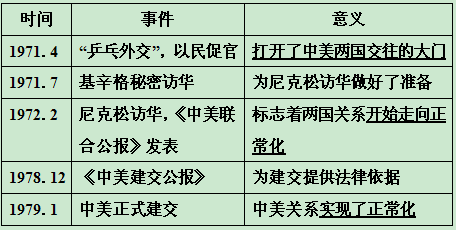 ③尼克松访华:1972年2月,尼克松总统访华,会见毛泽东主席,并与周恩来总理举行会谈,双方在上海签订《中美联合公报》。标志着中美之间结束了二十多年的敌对状态,两国关系开始走向正常化。