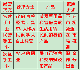 重点知识点梳理 1、古代中国手工业的经营形态 (1)产生: 手工业,是指依靠手工劳动,使用简单工具的小规模工业生产。开始从属于农业,主要表现为家庭手工业。原始社会晚期,手工业脱离了农业,形成独立的生产部门。 (2)发展: ①春秋战国时期,官营手工业继续发展,逐步形成官营手工业,私营手工业、家庭手工业三种经营形态。 ②到明代中后期,江南一些手工业部门又进一步发展为资本主义简单协作的手工业和工场手工业。