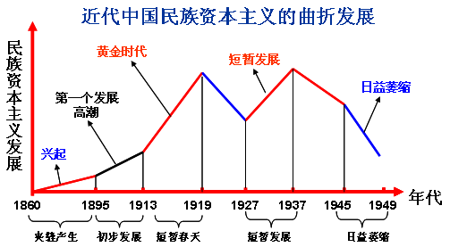 4、影响中国近代民族工业发展的因素 (1)推动因素: ①外国资本主义的入侵,在给中华民族带来沉重灾难的同时,也分解着中国自给自足的自然经济。 ②由于时代潮流的冲击和巩固统治的需要,清末至民国历届政府都鼓励兴办实业。 ③群众性反帝爱国运动的推动,特别是抵制洋货、提倡国货运动。 ④实业家的实业救国的思潮。 (2)阻碍因素: ①中国的半殖民地半封建社会性质,帝国主义、封建主义和官僚资本主义的压迫和束缚(主要因素)。 a.外国资本主义:限制中国机器进口;倾销商品和掠夺原料;发动侵华战争;签订一系列条约。 b.中国封建势力:封建政府不正式承认;苛捐杂税;大举内债和滥发纸币;直接投资,加入官股;收买、敲诈甚至没收 ②先天不足。与西方资本主义发展相比,中国近代民族工业缺乏资本、人才、技术、市场和思想观念的准备。 ③后天畸形。由于先天不足,使民族工业资金少,规模小,技术力量薄弱,因而投资方向和发展主要在轻工业领域,重工业基础薄弱,而且主要分布在沿海和通商口岸,这种工业结构和地区分布的失衡使民族工业呈畸形发展,未能形成独立完整的工业体系。 ④封建自然经济的抵制。 ⑤近代中国政局的长期动荡。 5、民族工业在中国近代史上的地位和作用 ①从经济上看,民族资本主义工业是一种新的经济因素,其产生和发展有利于社会进步; ②从政治上看,它导致民族资产阶级的产生和力量的发展,为维新变法运动和民主革命运动提供了社会基础,也导致无产阶级队伍的壮大,为新民主主义革命的到来和中国共产党的建立准备了阶级条件; ③从思想上看,中国民族资本主义的产生和发展,不断冲击和动摇着封建正统思想的统治地位,为西方资产阶级思想文化的传播提供了社会条件; ④从发展趋势上看,民族资本主义工业资金少、规模小、技术力量薄弱,没有形成完整的工业体系,地区分布不尽合理,在一定程度上依赖外国资本主义、本国封建势力和官僚资本主义,难以独立发展。