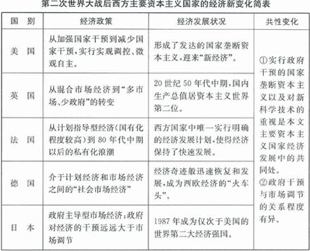 二战后主要资本主义国家的经济运行模式 1.二战后资本主义经济主要变化: ⑴在市场经济的前提下,各主要资本主义国家加强了对经济的干预。国家对经济的宏观调节,已经成为当代资本主义经济制度的一个重要组成部分。 ⑵福利国家在战后得到发展,特别在北欧地区,福利制度至为完善。 ⑶第三产业的蓬勃发展。 ⑷美国出现了以知识经济为基础的 “新经济”,高科技的发展和不断的技术创新,推动了美国经济的持续增长。 2.二战后的英国经济——混合市场经济 由混合市场经济到“多市场、少政府” (1)混合市场经济:①第二次世界大战后.英国政府信奉凯恩斯主义,实施国家干预政策,主张国家不采用经济计划的方式,而采用经济政策进行调控。②英国经济的发展显示出私人企业与国有化相结合、国家计划与市场经济相结合、同家干预与自由竞争相结合的特征,形成一种混合市场经济。 (2)撒切尔夫人经济政策的改变:①1979年,以撒切尔夫人为首的保守党执政。她放弃凯恩斯主义,改行货币主义政策,推出一系列经济改革政策,调整经济运行机制。②20世纪90年代,英国由第二次世界大战后的国家过多干预向经济自由主义转变;国家资本比重下降,私人资本得到加强;经济计划程度下降,自由市场作用增大,国家干预减弱,自由竞争加强。③这种“多市场、少政府”的转变已成为英国经济发展的趋势。 3.二战后的法国——计划指导型经济模式 (1)加大政府干预:第二次世界大战后,法国加大了政府干预经济的力度,以实现调整经济结构和加快经济发展的目标。 (2)计划指导型经济模式:①1946年,法国三党联合政府确定了大规模实施企业国有化、经济计划化和建设福利同家的发展方针。②在经济发展过程中,法国逐渐形成计划与市场相结合、国有企业与私人企业共存的计划指导型经济模式。③政府通过提高国有企业比重和制定经济计划,对社会经济进行全面指导和调节,并且利用财政、税收、价格等手段,使计划达到预期目的。 (3)经济发展状况:法国是西方国家中唯一实行明确的经济发展计划的国家,法国的政府干预模式使经济保持了快速发展。20世纪80年代中期以后,受新经济自由主义评价,法国也开始了私有化浪潮。 4.二战后的德国——“社会市场经济” (1)建立:1949年上台的阿登纳政府没有对联邦德国经济进行大规模的国有化改革,而是废除以行政控制为特征的中央统制经济,建立介于计划经济和市场经济之间的“社会市场经济”。 (2)特征:让市场充分发挥调:宵作用;同时,政府建立完善的社会保障制度,保障人民的基本生活。 (3)〖内容〗限制垄断行为,保护竞争秩序;实行稳定的财政政策和货币政策;用收入调节政策来实现相对的社会公平。 (4)成效:沿着这一发展模式,联邦德国经济奇迹般地迅速恢复和发展,成为西欧经济的“火车头”。 5.二战后的日本——政府主导型市场经济 (1)形成:第二次世界大战后初期,为了恢复和重建经济,日本政府实行“统制经济体制”,对国民经济进行高度统制。20世纪50年代中期以后,日本逐步确立起以市场调节为基础的自由竞争机制,但政府始终掌握社会经济计划和经济政策的决策权,形成政府主导型市场经济。 (2)特征:政府对经济的干预远远大于市场调节。 (3)成效:①1987年,日本成为仅次于美周的世界第二经济大国。②进入20世纪90年代,尽管日本出现“泡沫经济”,经济发展速度有较大幅度下降,但是日本作为经济强国的地位没有动摇。 6.当代西欧和日本各资本主义国家政府干预经济的特点 (1)英国和法国战后都推行国有化运动,扩大国有经济成分,联邦德国没有进行大规模的国有化改革。 (2)英国不采用计划经济的方式,而法国、日本都由政府制定经济计划,对经济、企业进行有计划的指导与调节,联邦德国则建立了介于计划经济和市场经济之间的“社会市场经济”。 (3)英国、法国、联邦德国都致力于建立完善的社会保障制度。与美英相比,联邦德国政府致力于货币的稳定,宁可忍受大量实业的压力,没有采用财政赤字的手段解决就业问题,联邦德国特别注意用收入政策来实现相对的社会公平,为此专门颁布实施了一系列法律。 7.第二次世界大战后西方主要资本主义国家的经济新变化简表: