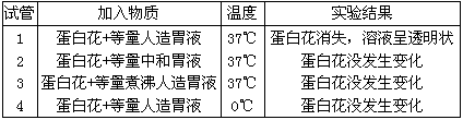 ①第1号试管内蛋白花消失,溶液呈透明状。说明胃液中含有的蛋白酶在与人体正常体温接近的37℃左右的酸性环境里,能把蛋白质分解成溶解于水的多肽。