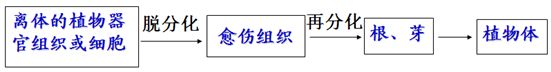 植物组织培养的基本过程 〖过程〗 离体的植物组织或细胞,在培养了一段时间以后,会通过细胞分裂,形成愈伤组织,愈伤组织的细胞排列疏松而无规则,是一种高度液泡化的呈无定形状态的薄壁细胞。 由高度分化的植物组织或细胞产生愈伤组织的过程,称为植物细胞的脱分化,或者叫做去分化。 脱分化产生的愈伤组织继续进行培养,又可以重新分化成根或芽等器官,这个过程叫做再分化。 再分化形成的试管苗,移栽到地里,可以发育成完整的植物体。