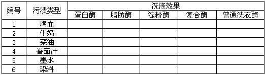 探究不同种类的加酶洗衣粉对同一污物和不同污物洗涤效果的比较 〖实验原理〗 不同种类的加酶洗衣粉所加的酶不同,而酶具有专一性,所以对不同污渍洗涤效果不同。 〖实验流程〗 1、取30块大小相同的白棉布,分成6组,每组5块,依次编号1a、1b、1c、1d、1e、2a、2b…6a、6b、6c、6d、6e。 (a为蛋白酶处理组,b为脂肪酶处理组,c为淀粉处理组,d为复合酶处理组,e为普通洗衣粉组) 2、制取带有污染物的实验用布: 给第一组白布滴加鸡血,待血渍扩散停止后,记录血渍面积。 按同样的方法给第2-6组分别滴加牛奶、菜油、番茄汁、墨水、颜料,并记录污渍面积。 3、将上述白棉布分别放入30个已编号的烧杯中,各注入500ml蒸馏水,用玻璃棒搅拌使白棉布湿透。 4、温度控制:烧杯均放入温度为45度的水浴锅。 5、洗衣粉洗涤: 给1a-6a号烧杯中加入等量的蛋白酶洗衣粉,给1b-6b号烧杯中加入等量的脂肪酶洗衣粉; 给1c-6c号烧杯中加入等量的淀粉酶洗衣粉; 给1d-6d号烧杯中加入等量的复合酶洗衣粉; 给1e-6e号烧杯中加入等量的普通酶洗衣粉; 各烧杯均搅拌洗涤10分钟后,用清 水漂洗3次,晾干。 〖实验结果〗 不同种类的洗衣粉对同一污渍或不同污渍洗涤效果的列表比较: