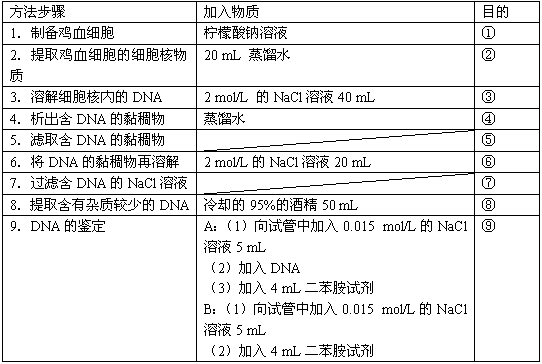 1、防止血凝。 2、加速血细胞破裂。 3、溶解DNA。 4、使2 mol/L的NaCl溶液稀释至0.14 mol/L,促DNA最大限度地析出。 5、使含DNA的黏稠物被留在纱布上。 6、使含DNA的黏稠物尽可能多地溶于 溶液中。 7、除去含DNA的滤液中的杂质。 8、提取DNA 。 9、A:出现蓝色 。B:无变化