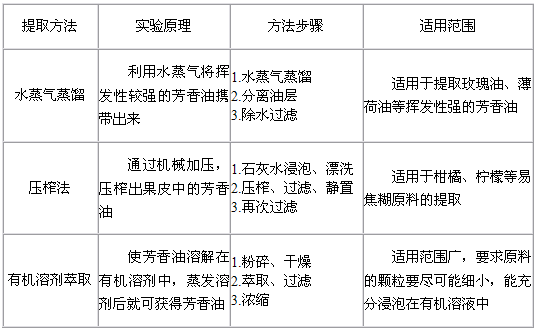 水蒸气蒸馏、压榨法、有机溶剂萃取方法的比较
