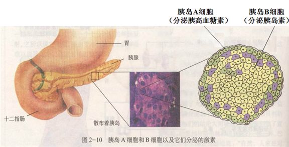 胰腺中散布着胰岛;胰岛细胞可以分泌胰岛素、胰高血糖素等,调节血糖平衡。
