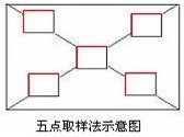 常用的为五点取样法,如图,当调查的总体为非长条形时,可用此法取样。在总体中按梅花形取5个样方,每个样方的长和宽要求一致。这种方法适用于调查植物个体分布比较均匀的情况。
