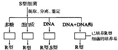 (2)分析 S型细菌的DNA使R型细菌发生转化。 S型细菌的其他物质不能使R型细菌发生转化。 (3)结论 S型细菌体内只有DNA才是“转化因子”,即DNA是遗传物质。 〖关键点〗 1、加热杀死S型细菌的过程中,其蛋白质变性失活,但是其内部的DNA在加热结束后随温度的恢复又逐渐恢复其活性。 2、R型细菌转化成S型菌的原因是S型菌DNA与R型菌DNA实现重组,表现出S型菌的性状,此变异属于基因重组。 3、本实验还遵循了实验设计的对照性原则,增强了结果的科学性和可信度。 例如,体内转化实验中,注射R型活细菌与注射S型活细菌相对照,说明S型活细菌有毒性;体外转化实验中,各组互为对照,说明只有DNA才是遗传物质。