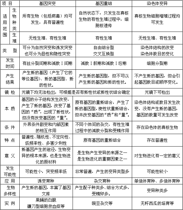 比较染色体变异与基因突变、基因重组的异同 〖比较〗