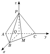 分析:(1)直接利用体积公式求解; (2)以$O$为坐标原点,$OB$为$x$轴,$OC$为$y$轴,$OP$为$z$轴,建立空间直角坐标系,求得平面$PAC$的法向量,即可求解. 解:(1)在三棱锥$P-ABC$中,因为$PO\bot$底面$ABC$,所以$PO\bot AC$, 又$O$为$AC$边中点,所以$\Delta PAC$为等腰三角形, 又$AP=AC=2$.所以$\Delta PAC$是边长为2的为等边三角形, $\therefore PO=\sqrt{3}$,三棱锥体积$V_{P-ABC}=\dfrac{1}{3}{S}_{\Delta ABC}\cdot PO=\dfrac{1}{3}\times \dfrac{\sqrt{3}}{4}\times {2}^{2}\times \sqrt{3}=1$, (2)以$O$为坐标原点,$OB$为$x$轴,$OC$为$y$轴,$OP$为$z$轴,建立空间直角坐标系,