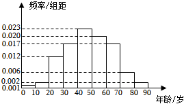 (12分)在某地区进行流行病学调查,随机调查了100位某种疾病患者的年龄,得到如下的样本数据的频率分布直方图: (1)估计该地区这种疾病患者的平均年龄(同一组中的数据用该组区间的中点值为代表); (2)估计该地区一位这种疾病患者的年龄位于区间$[20$,$70)$的概率; (3)已知该地区这种疾病的患者的患病率为$0.1%$,该地区年龄位于区间$[40$,$50)$的人口占该地区总人口的$16%$.从该地区中任选一人,若此人的年龄位于区间$[40$,$50)$,求此人患这种疾病的概率(以样本数据中患者的年龄位于各区间的频率作为患者的年龄位于该区间的概率,精确到0.0001 ).