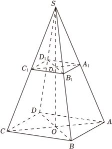 (5分)底面边长为4的正四棱锥被平行于其底面的平面所截,截去一个底面边长为2,高为3的正四棱锥,所得棱台的体积为 ____. 分析:根据题意易知△$SO_{1}A_{1}\backsim \Delta SOA$,从而可求出台体的高,再根据台体的体积公式,计算即可得解. 解:如图所示,根据题意易知△$SO_{1}A_{1}\backsim \Delta SOA$,