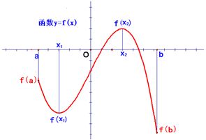 Ⅲ、方法2: 若函数y=f(x)在定义域 [a,b] 上连续,则 ①求函数y=f(x)在(a,b)内的极值; ②求函数在端点的函数值f(a),f(b); ③将函数y=f(x)的个极值与端点函数值f(a),f(b)比较,其中最大的一个为最大值,最小的一个为最小值。 如图,定义在[a,b]上的连续函数y=f(x),求得极值为f(x1 )、f(x2 ),求得定义域端点的函数值为f(a)、f(b),则函数的最大值与最小值分别为 $y_{\max}=\max \{f(x_1),f(x_2),f(a),f(b) \}$, $y_{\min}=\min \{f(x_1),f(x_2),f(a),f(b) \}$.