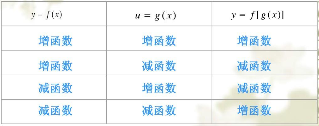 若$u=g(x)$在$[a,b]$上是单调增(减)函数$,y=f(u)$在区间$[g(a),g(b)]$(区间$[g(b),g(a)]$)上是单调增(减)函数,那么复合函数 $y=f[g(x)]$在$[a,b]$上一定是单调的,具体分为以下四种情况: