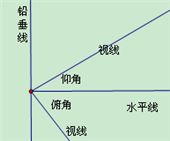 - 仰角和俯角:与目标在同一铅垂平面内的水平线和目标视线的夹角。目标视线在水平线上面时角仰角,目标视线在视平线下方时叫做俯角。如图示: