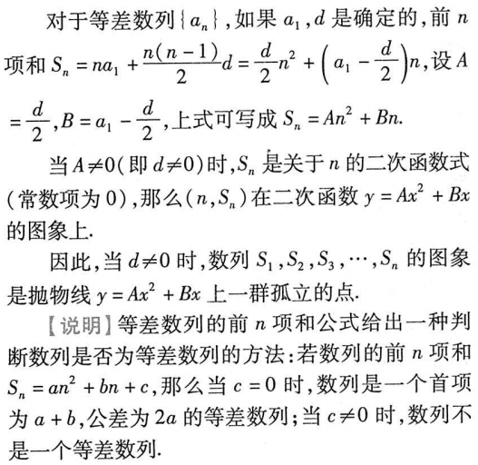 9.2.5等差数列前n项和公式与函数的关系 对于等差数列{a.},如果“,d是确定的,前n+n-1)d=-n+(a -号)n,设A S =na,+=-,B=a-2,上式可写成S_=An +Bn. 当A≠0(即d≠0)时,S,是关于n的二次函数式(常数项为0),那么(n,S)在二次函数y=Ax’+Bx的图象上. 因此,当d≠0时,数列S,,S,,S,,…,S,的图象是抛物线y=Ax’+Bx上一群孤立的点 【说明】等差数列的前n项和公式给出一种判断数列是否为等差数列的方法:若数列的前项和S.=an’+bn+c,那么当c=0时,数列是一个首项 为a+b,公差为2a的等差数列;当c≠0时,数列不是一个等差数列