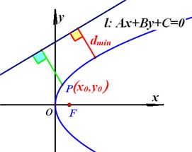 。 此外,求抛物线切线方程的一般方法是:“联立—消元— ”。 3o 抛物线与直线相离,则可求抛物线与直线距离最近的点,或直线与抛物线最短的距离。 设抛物线 ; ,直线 。 方法1:如图, 是抛物线上任意一点,求点 到直线 的距离最小值,这最小值就是直线与抛物线的最短距离。即求 的最小值。