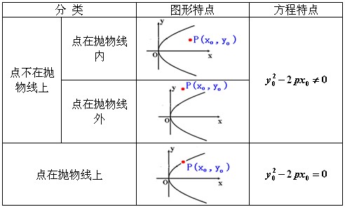 Ⅱ、判断方法: (1)“以点代面”判断法:即在抛物线外找一特殊的点 ,将其坐标代入抛物线方程 的左边式子,得 或 则判断出 或 的点与点 在同一区域内。 (2)“关系结论”判断法: 对于抛物线 而言,已知点 , 若 则点 在抛物线上; 若 则点 在抛物线内; 若 则点 在抛物线外。