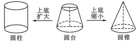 当圆台的上底面与下底面相同时,圆台转化为圆柱;当圆台的上底面缩小为一个点时,圆台转化为圆锥.如图所示,