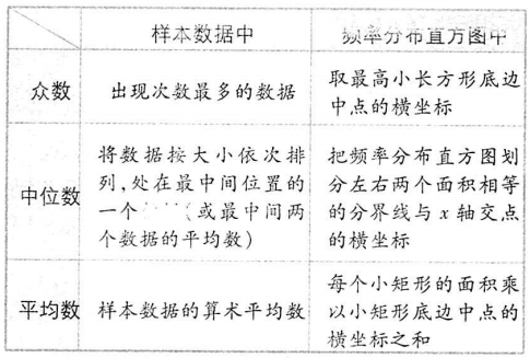 (1)众数体现了样本数据的最大集中点,但它显然对其他数据信息的忽视使得无法客观地反映总体特征。 (2)中位数对极端值不敏感,仅利用中间数据的信息。 (3)平均数与每一个样本数据有关,能更多地反映关于样本数据全体的信息,但平均数受极端值影响大,使用平均数估计总体时,可靠性降低。  【说明】(1)若有两个或几个数据出现得最多且出现的次数一样,这些数据都是这组数据的众数;若一组数据中,每个数据出现的次数一样多,则认为这组数据没有众数. (2)由于平均数与每一个样本的数据有关,所以任何一个样本数据的改变都会引起平均数的改变,这是众数、中位数不具有的性质.也正因为这个原因,与众数、中位数比较起来,平均数可以反映出更多的关于样本数据全体的信息,但平均数受数据中的极端值的影响较大,使平均数在估计总体时可靠性降低. (3)各数字特征的优缺点:众数体现了样本数据的最大集中点,但它对其他数据信息的忽视使得无法客观地反映总体特征;中位数是样本数据所占频率的等分线,它不受少数几个极端值的影响,这在某些情况下是优点,但它对极端值的不敏感有时也成为缺点.因为这些极端值有时是不能忽视的.