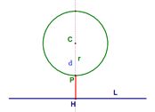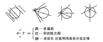 ⑵代数方法: 联立直线与圆方程的方程组,由方程组解的个数做出判断。其步骤为: 1° 将直线方程与圆的方程联立成方程组; 2° 利用消元法,得到关于某一个元的一元二次方程; 3° 求出一元二次方程的判别式Δ的值; 4° 比较Δ与0的大小:若 ,则直线与圆相离;若 ,则直线与圆相切;若 ,则直线与圆相交。反之也成立。 |