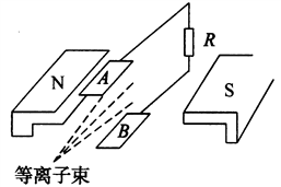 ,喷入气体速度为v,板间磁场的磁感应强度为B,板外电阻为R,当等离子气体匀速通过A、B板间时,A、B板上聚集的电荷最多,板间电势差最大,即为电源电动势。此时离子受力平衡: