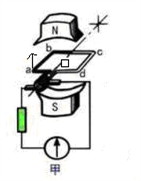 如图所示,当线圈平面逆时针转动位于(乙、丁图)时,即线圈平面与磁感线平行时,ab、cd边的线速度方向都跟磁感线垂直,即两边都垂直切割磁感线,这时感应电动势最大,线圈中的感应电流也最大。