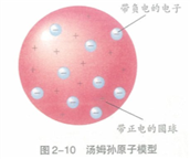 汤姆生认为,原子带正电的部分充斥整个原子,很小很轻的电子镶嵌在球体的某些固定位置上,正像葡萄干嵌在面包中那样,这就是原子的葡萄干面包模型。